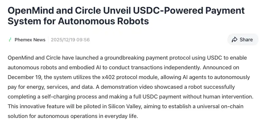 2025 年 12 月,OpenMind 与稳定币发行商 Circle 联合宣布,推出基于 x402 协议的机器人自主支付系统。随着机器人能力的提升,它们将不再仅仅是执行任务的工具,而是开始扮演自主经济体的角色。它们需要购买算力、数据、技能,甚至雇佣其他机器人或人类来完成复杂任务。