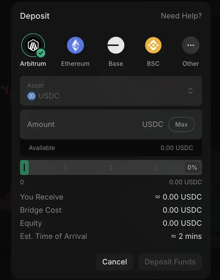 目前大多数 Perp DEX 都是支持 Arbitrum 网络充值的,所以准备好 Arbitrum 网络上的 USDC,一般就可以横行 Perp DEX。