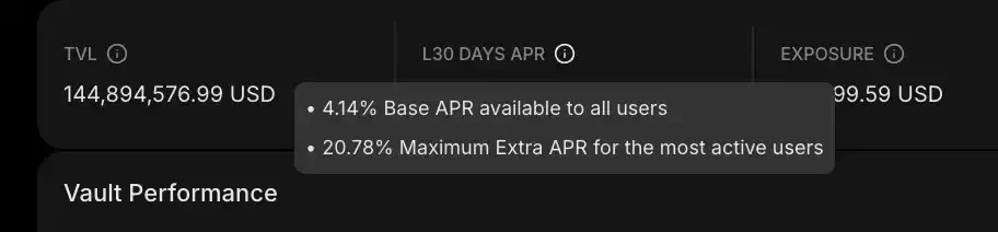 Extended 金库的收益分两块:基础收益和额外收益,过去 30 天的 APR 是 24.92%。基础收益是所有存款用户都能拿到的,目前是 4.14%APR,通过 XVS 价格的持续上涨来体现,金库的收益途径和其他 Perp DEX 差不多主要还是做市交易和清算手续费。额外收益则是和账户的交易活跃度挂钩,从骑士 (Knight) 等级开始,就能享受额外收益,目前最高是 20.78%APR。