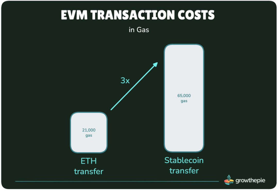 目前,这类低成本原生转账占以太坊所有交易的近 50%。相比之下,发送一枚 ERC20 代币约需消耗 65000 Gas,一笔稳定币转账的 Gas 消耗,相当于三笔 ETH 转账之和。