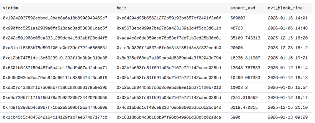 Andrey Sergeenkov 测算,该骗局的实际成功率约为 0.01%,这意味着其商业模式本就建立在容忍极高失败率的基础上。在他分析的数据集中,116 名受害者总计损失约 74 万美元,其中单笔最大损失达 50.9 万美元。