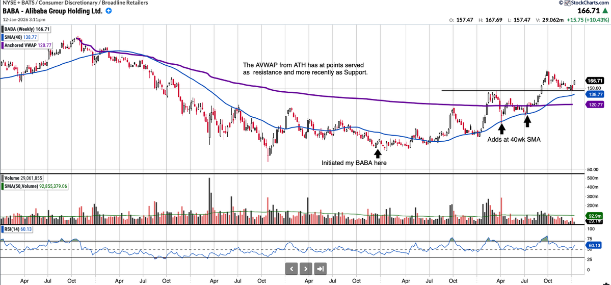 回顾2023年,BABA是一个很好的例子。尽管该股在前一年已在每股55美元触底,但有投资者选择在2023年12月,当股价在68至70美元之间时入场。当时,该股正在筑底,且股价与价值之间存在巨大错位,市盈率仅为7倍。之后,在股价回测40周SMA(简单移动平均线)时,该投资者又进行了加仓,并至今仍持有这些股份。