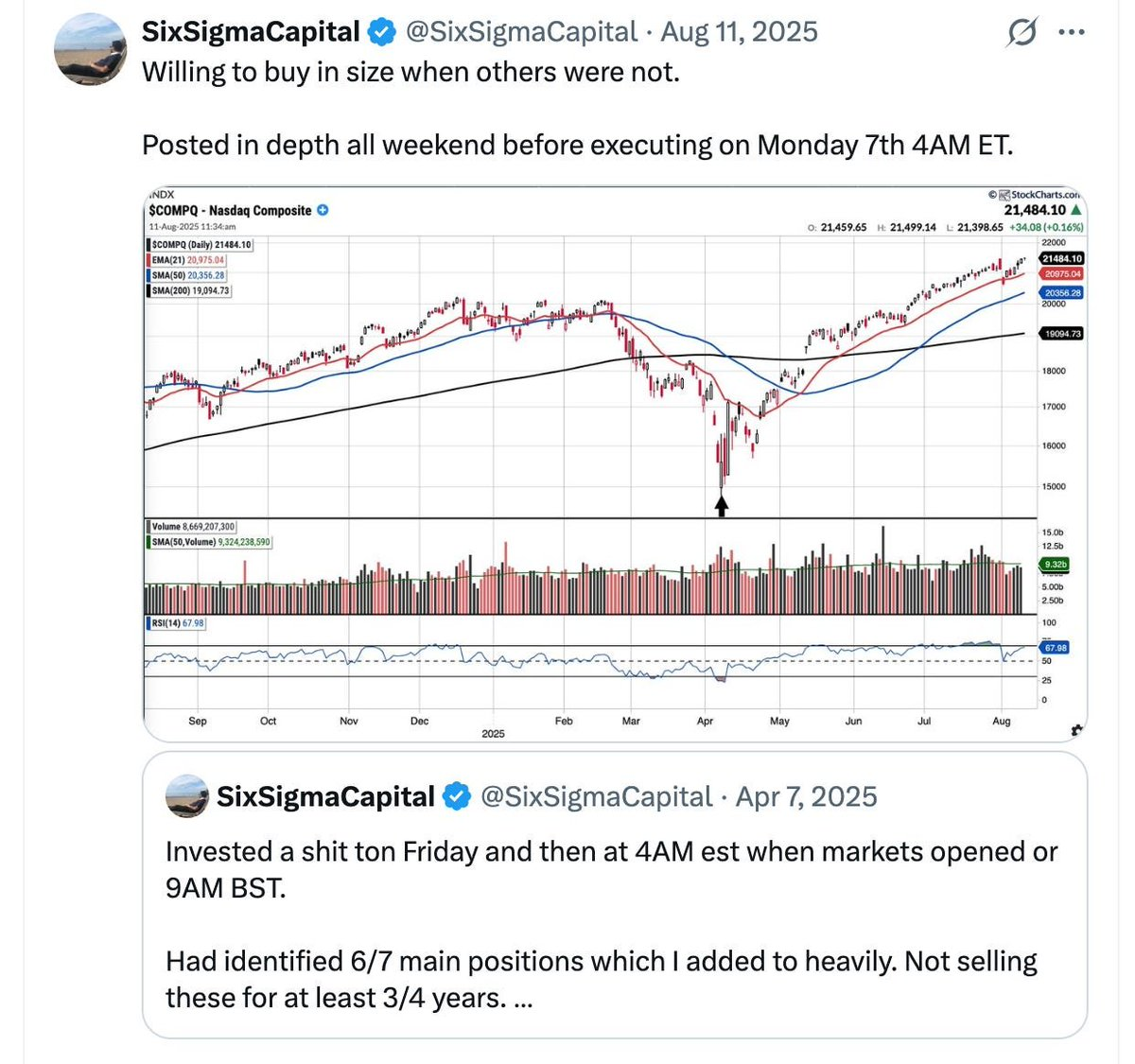 另一个瀑布式下跌的买入案例是成功捕捉到2025年4月7日的底部。在那个周一凌晨4点(美东时间)执行交易之前,整个周末都对此进行了深入的分析。