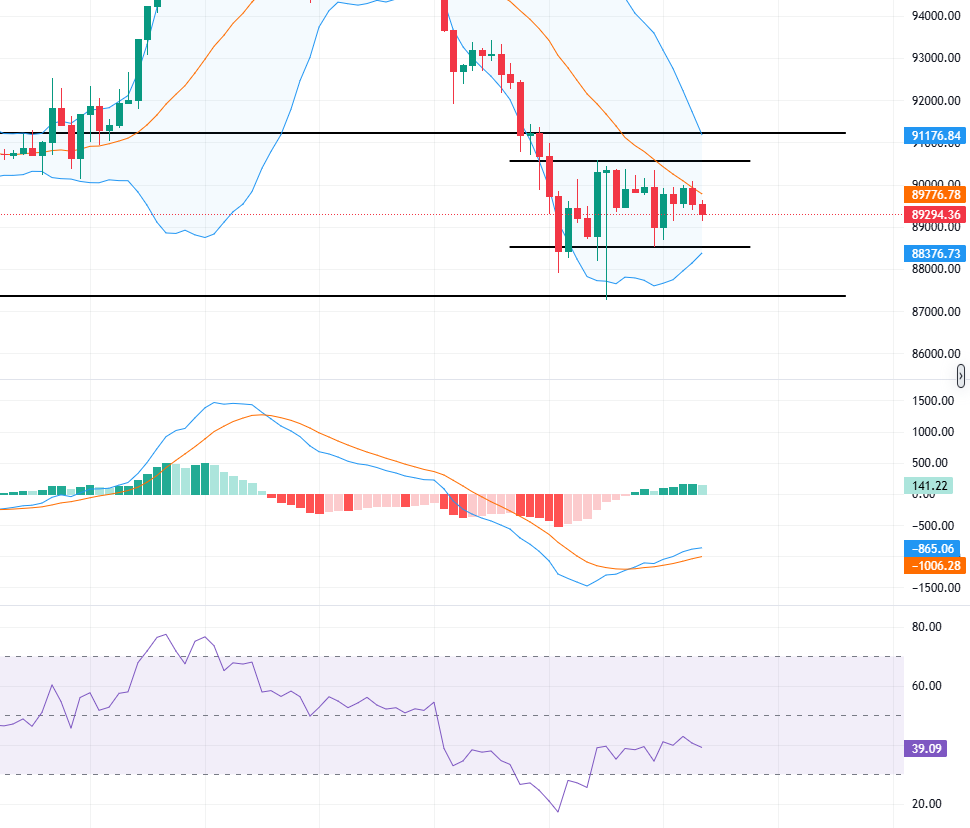 四小时级别上,布林带开始缓慢缩口,MACD 动能柱持续缩量,预示市场正处于变盘前夜,晚间价格大概率延续偏弱走势。需重点关注关键支撑阻力位的得失:比特币上方阻力聚焦日内高点 90400 和四小时上轨 91200,下方支撑留意四小时下轨 88500 和昨日低点 87200;以太坊上方阻力关注 3000 整数关口和昨日凌晨高点 3060,下方支撑盯紧四小时下轨 2900 和昨日低点 2870,一旦关键支撑失守,行情或将触发新一轮下行。