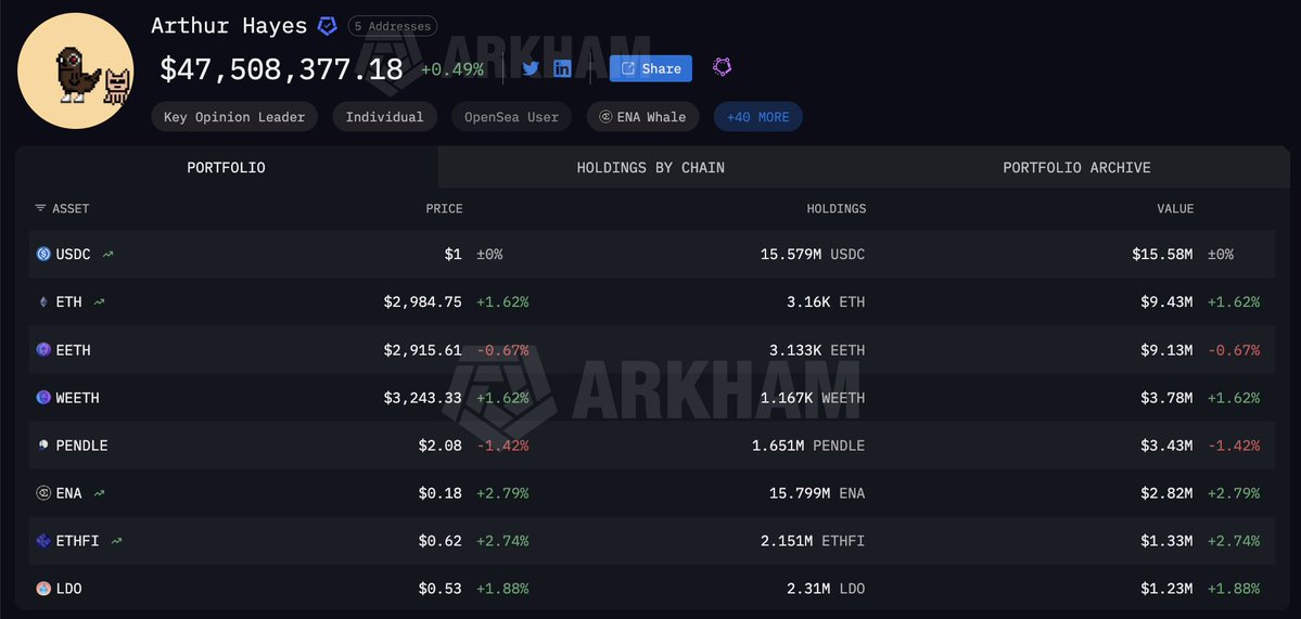 亚瑟·海耶斯目前在链上的盈亏为1300万美元,但他经常在FalconX、Kraken、Galaxy Digital和Binance等中心化服务上进行交易和持有资产。他是在抄底吗?