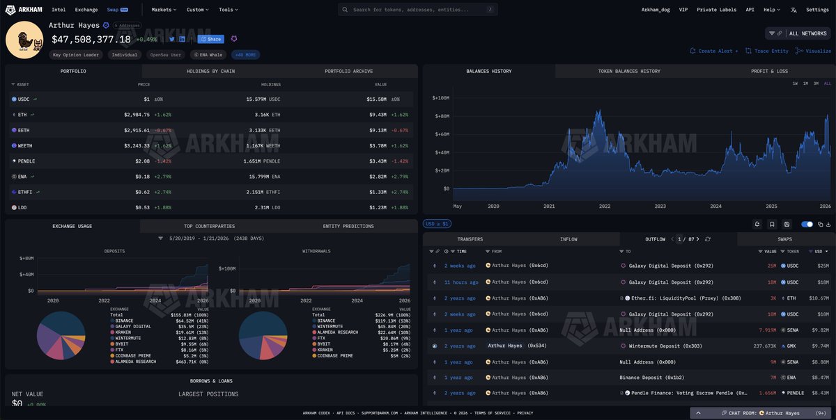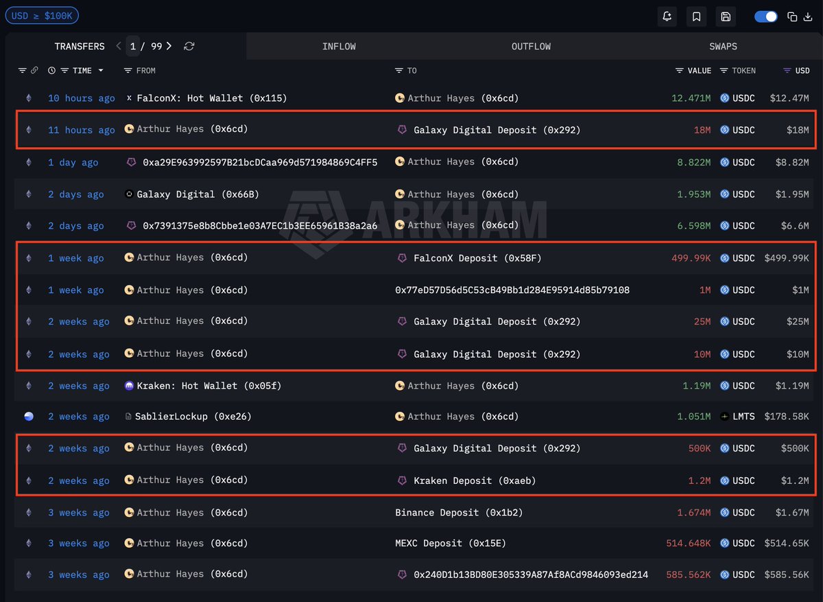 亚瑟·海耶斯刚刚向Galaxy Digital存入了1800万美元的USDC。在过去的三周里,他总共向FalconX和Galaxy Digital存入了5450万美元。