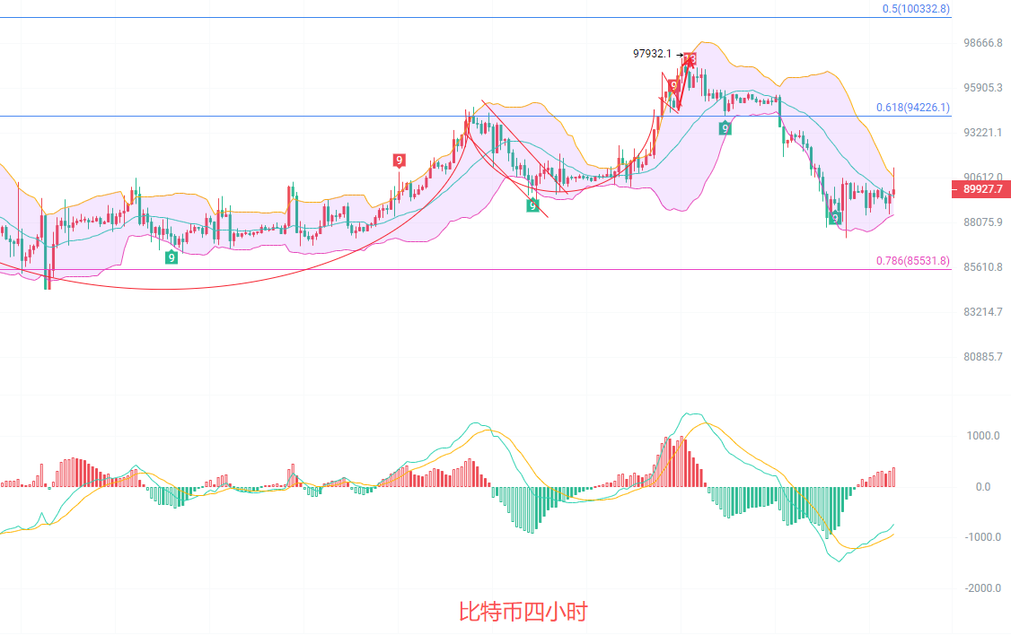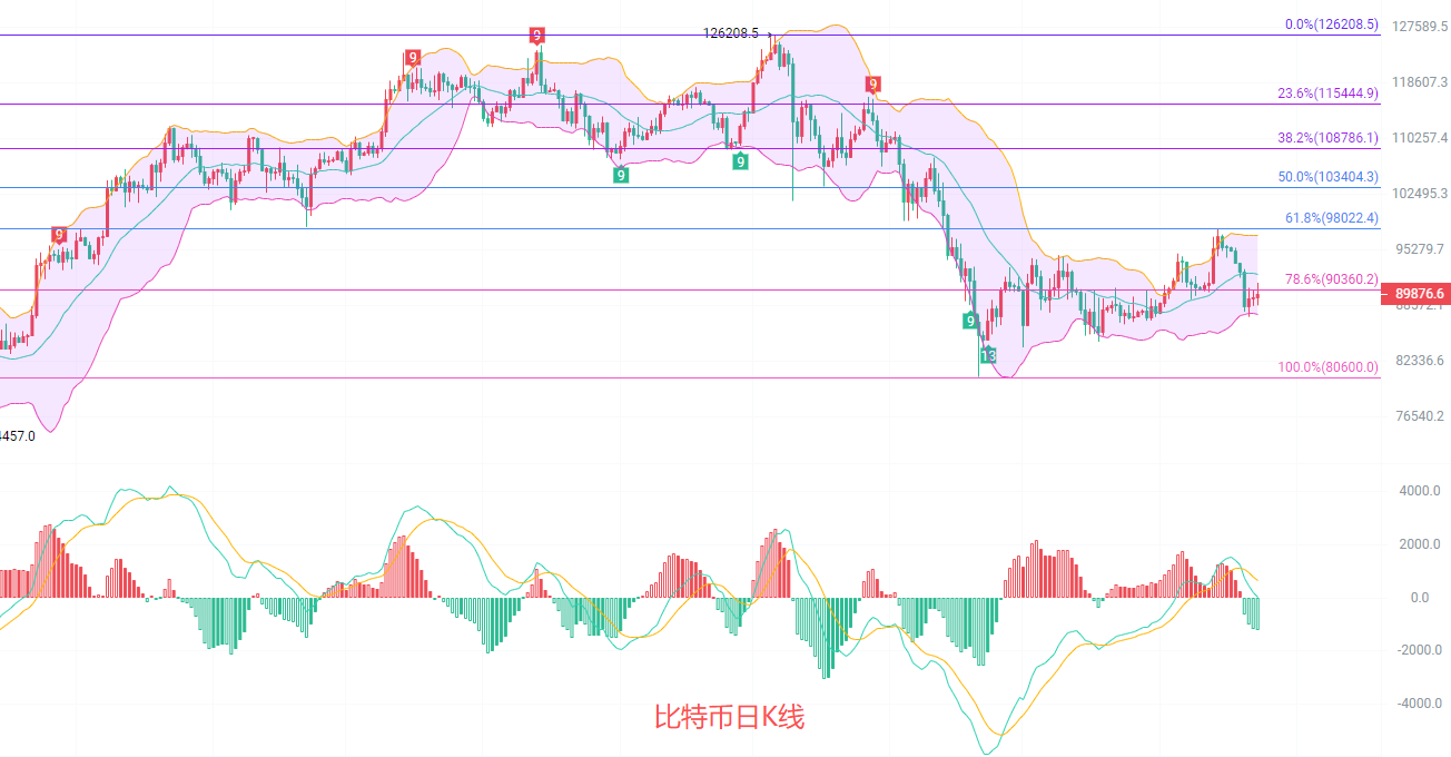 Before the article was published, the daily K-line reached a high of 91,200 and a low of 88,530. The EMA trend indicator continues to contract and move south. The pressure levels formed by EMA 15 and 30 are effective to observe. The MACD continues to decrease in volume with accumulation, and the DIF and DEA are impacting downward on the 0 axis. If the market continues to move south, it will enter below the 0 axis. Pay attention to the upper Bollinger Band at 92,300. If the middle band is lost, stop-loss and exit; otherwise, hold on, targeting the lower band at 87,500.