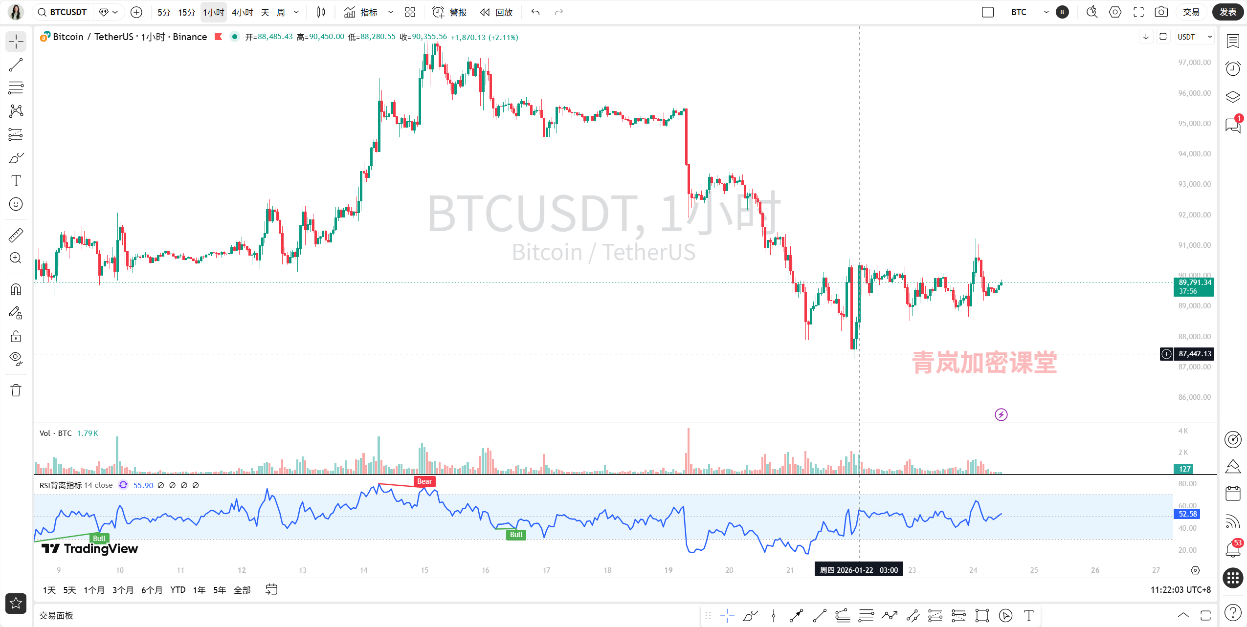 4小时图(中期-关键抉择期): 这是目前最关键的周期!价格在1月20日暴跌后,形成了一个下降通道。最近几天一直在通道下轨(约89000)和上轨(约90500)之间震荡。好消息是,MACD的绿柱开始出现,快慢线在低位有金叉迹象,这是一个潜在的底背离信号(价格没创新低,指标走强)。但坏消息是,价格始终无法有效站上MA10均线(约89600)。所以,4小时级别正处在一个 “是筑底反弹,还是下跌中继” 的关键抉择窗口。90500-91000 是决定中期趋势能否扭转的核心阻力区。