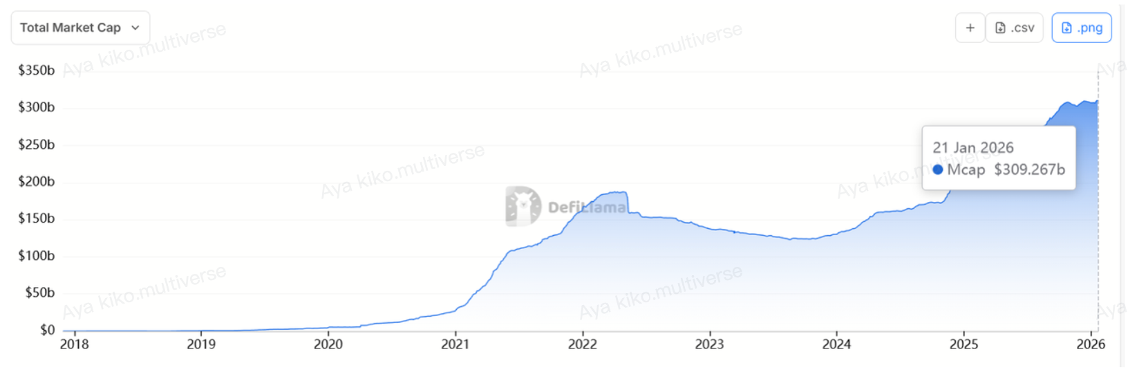 • 稳定币与资金流动:稳定币作为加密市场的关键基础设施,其发行与流通规模直接反映场内资金的“蓄水池”状况,也受宏观环境影响。牛市中,资金涌入推动稳定币市值快速攀升,熊市则稳定币需求下降、规模收缩。稳定币供应的变化往往领先或同步反映资金进出市场的动态。例如,2020-2021年牛市中USDT、USDC等稳定币供应从不足300亿美元暴增至2021年底的约1500亿美元以上;而2022年熊市中总市值略有回落,2023年初约在1300亿美元附近企稳。进入2024-2025年新一轮行情,稳定币市场再度扩张,目前全球稳定币总市值已突破3000亿美元,较一年前增长约75%。