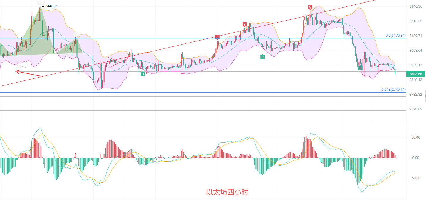 日K线发稿前最高2960,最低2874,EMA趋势指标向下扩散跌破了黄可分割线0.786一线,EMA15趋势快线已经来到了3060,按照这种趋势上判断,短线压力位在3000关口附近,MACD缩量走空,DIF和DEA跌入0轴线进入南下趋势,布林带下轨来到了2830,若行情继续走南,那么布林带向下就会形成新的空势,