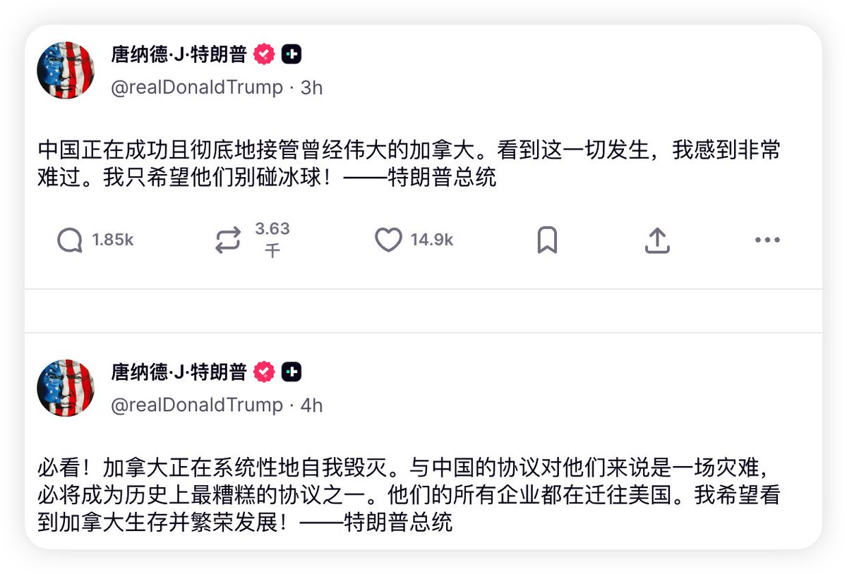 最近的周末都好过,今天的作业也不好写,刚刚结束了格陵兰的关税,本来想要喘口气结果 $BTC 又在下跌,而且在周末就跌的挺厉害了,这次引发的可能有三种情况,第一就是川普对加拿大和中国的一项贸易协定非常的不满,昨天已经讲过了,但今天川普仍然连发了两篇文章来告诫加拿大。