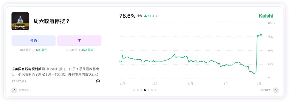 导致目前 Kalshi 预期停摆的概率直接冲到了 78.5% ,不过这次的停摆可能并不像去年10月一样几乎全面的停摆,这次已经有部分的职能部门拿到了全年的预算,不会进入停摆,所以相对来说,即便是进入停摆,但和10月相比应该规模不会更大。