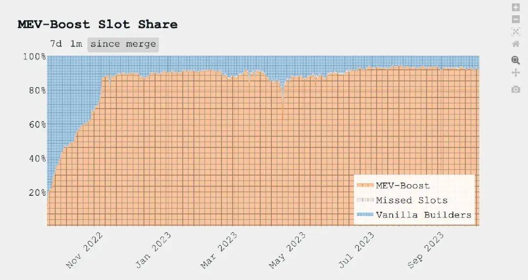 2. 矿工激励降低,促使验证者更乐意接受 MEV 的交易拍卖,在短短的 2-3 月让 MEV 达到 90%的市占率。