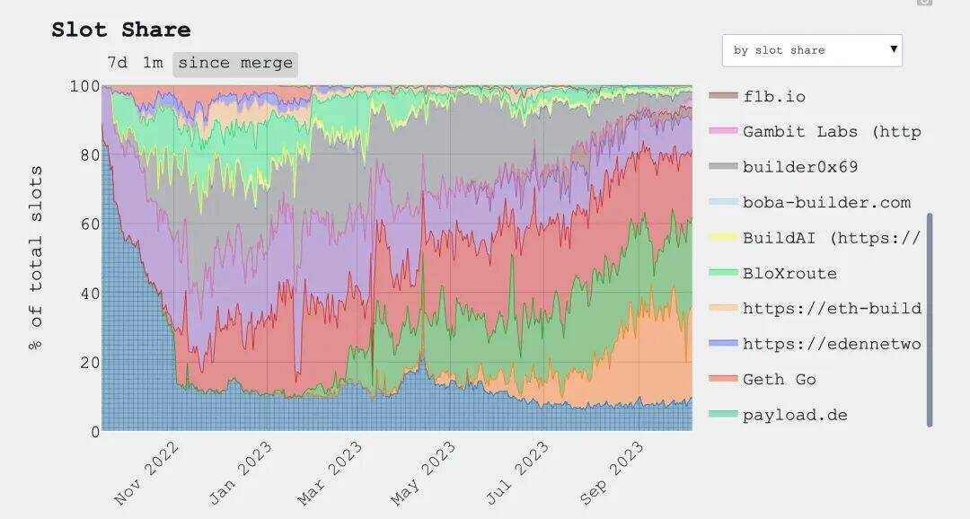 这个模型在某种意义上是成功的 —— 截至 2023 年底,Flashbots 占据了 MEV-Boost 市场的 90% 以上份额,形成了事实上的“链下排序中枢”。