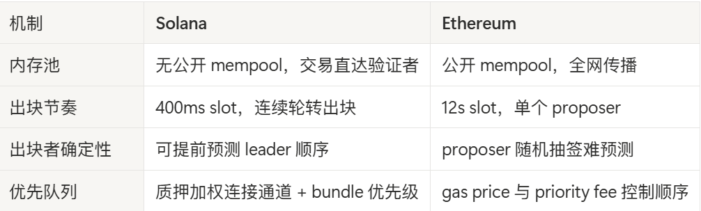 Solana 本身就是为高速而设计的链,没有传统意义上的公开 mempool,交易通过对等节点直接广播给下一轮的出块者 leader。其结构性特点如下:
