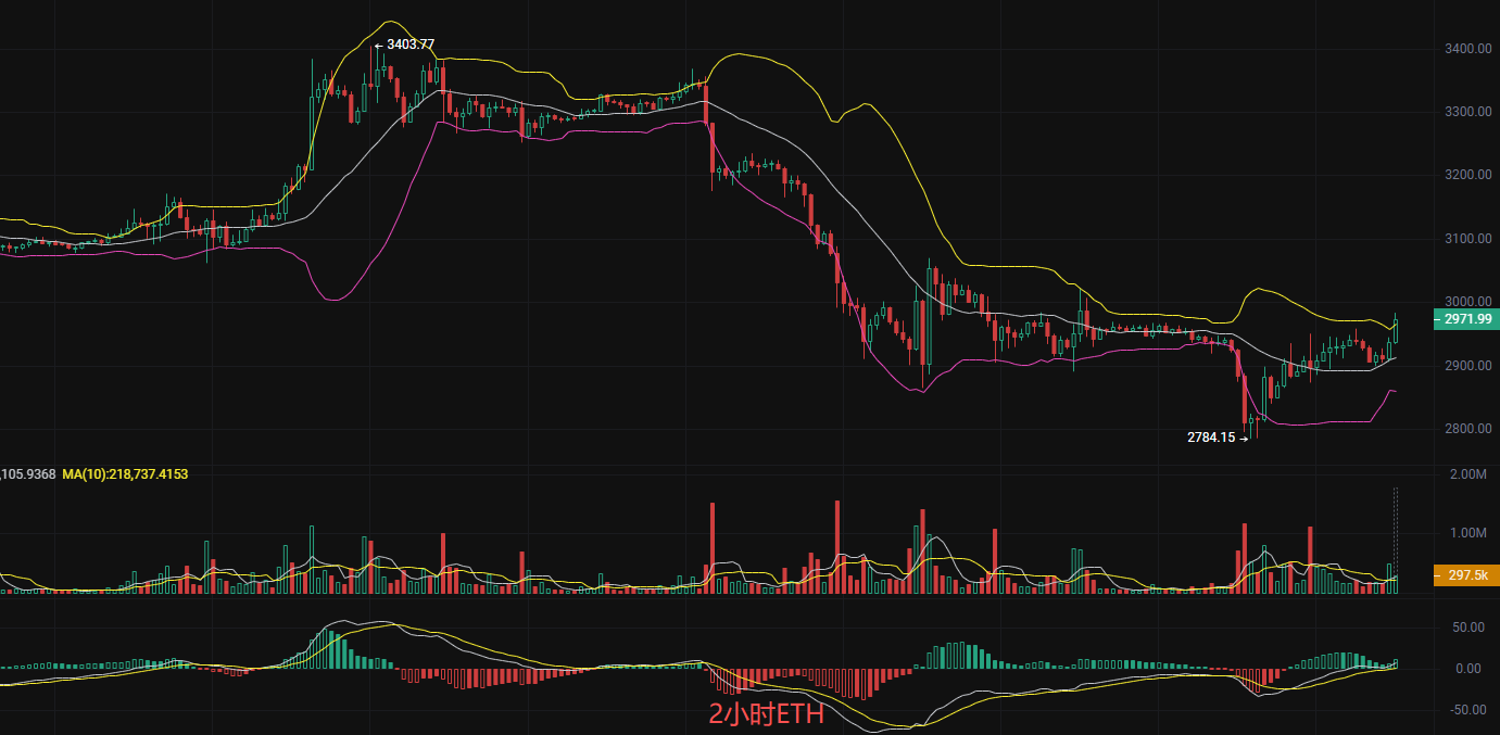 发稿前以太坊现价2970,丽盈昨日给的哆的思路现在已经涨起来了,行情还没有走完,继续上看,目前主力从低点2816快速反弹至2964,形成明显的多头趋势。日K线连续两日收阳显示上涨动能较强。MACD2小时多头信号明确。主力已经站稳EMA7与EMA30之上,短期均线呈现多头排列,EMA120为下一压力位,若主力破3000,那么大概率还会继续上行冲击,短哆思路不变