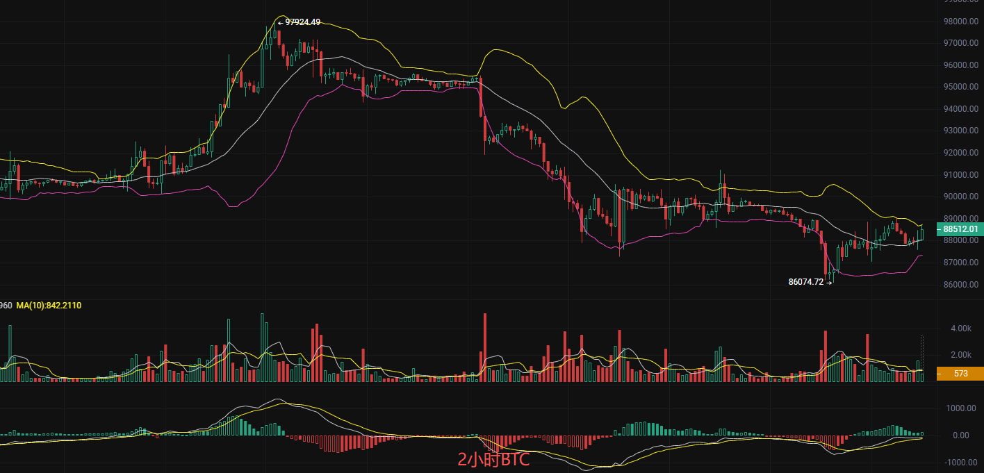 比特币现价88500,丽盈昨日给的低哆,现在行情已经涨起来了,多的不说,来看盘口日线在88000和89000区间震荡,前期从86670快速拉升至88534后进入高位整理。2小时K线呈现小幅上涨趋势,但上影线较多,表明上方抛压明显,MACD2小时短期内可能面临回调压力。EMA整体反弹力度不够,哆并没有引来爆发朝,所以丽盈建议继续持有