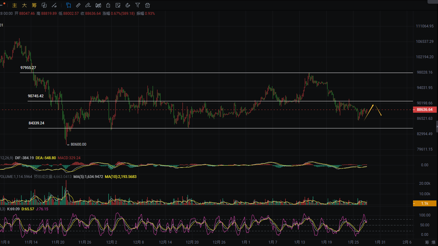 From a technical perspective, Bitcoin's recent price has been fluctuating in the range of 87,000 to 89,000, without breaking through in a clear direction. The daily chart shows a series of small upward movements, but with long upper shadows, indicating heavy selling pressure above. The technical indicators show that the hourly MACD has formed a golden cross but is gradually flattening, with the momentum bars shortening, indicating a weakening trend; on the daily chart, the DIF and DEA are close to the zero axis, and the market is in a state of fluctuation. The hourly RSI is at 59, slightly strong but neutral; the daily RSI is at 62, close to the overbought area but not yet in it, still having some upward space. The hourly EMA7 has been stabilized, EMA30 is providing support, and EMA120 is the current resistance level. The daily EMA shows a bullish arrangement, with a short-term upward trend.