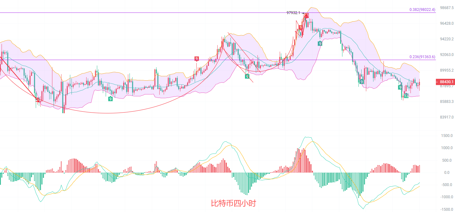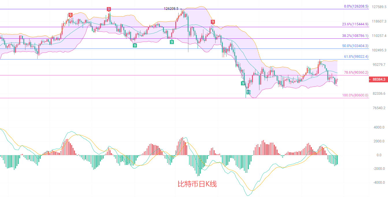 日K线发稿前最高88980,最低87265,EMA南下趋势不变,EMA15已经抵达了9万关口,跌破了0.786一线90360,MACD依旧是缩量阶段,DIF和DEA向下扩散不变,布林带下轨已经抵达了85500,还在进一步走低,K线在88000附近,下方支撑下移上方压力也在下移,这个时候回调并不是北上而是南下的机会