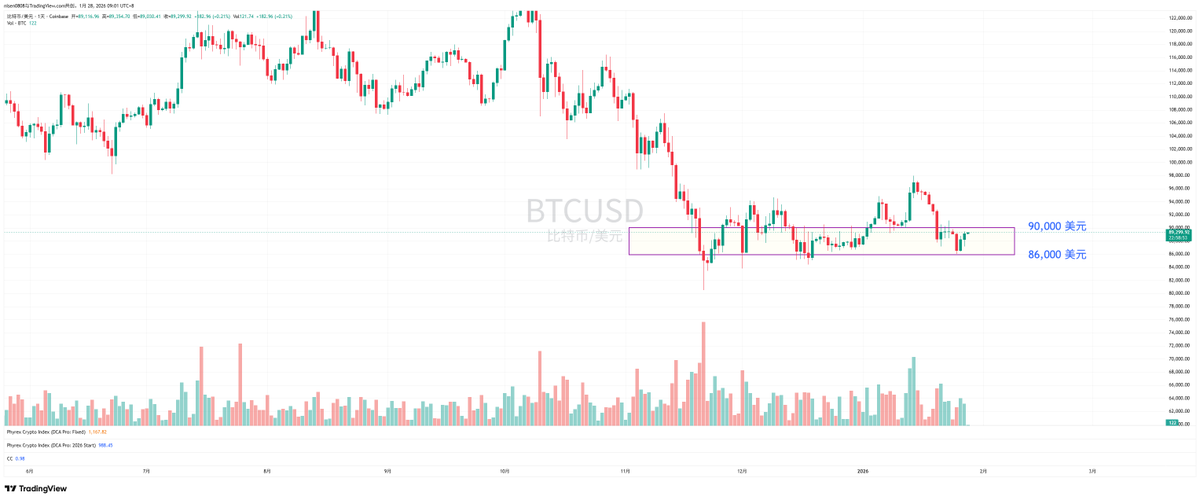 从实际结果来看,最近两周 $BTC 的价格仍然是处于震荡的趋势,但如果把时间拉长却可以发现从 11月20日 一直到现在这两个月的时间 Bitcoin 的价格一直在 90,000 美元附近震荡,冲破到 90,000 美元上方以后就会出现各种状况跌下来。