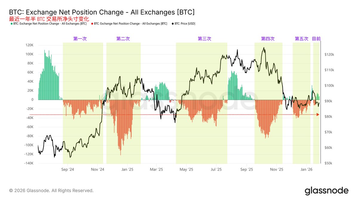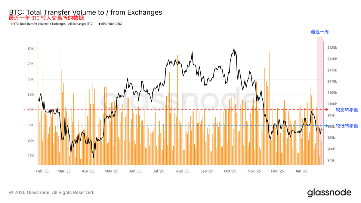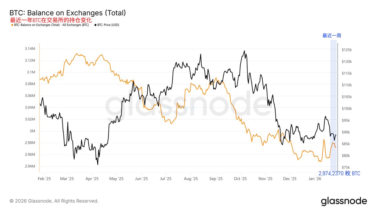 既然知道大方向上投资者在积极的买入美股,认为美股在 2026年应该会有不错的发展,那么最起码 BTC 的抛售应该不会太多,投资者即便是少买,卖出量也不会大。从交易所存量 Bitcoin 的数据中就能看出,虽然最近一周的利空不断,但转入交易所等待抛售的筹码并不是很多,相较上周低点也就是多转移了 20,000 余枚 BTC。