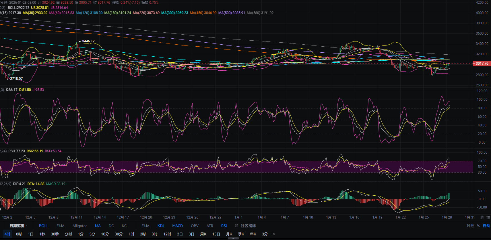 4小时k线冲击当前上轨与MA60交叉位置有受压迹象,KDJ三线也是超买后出现拐头迹象,包括RSI三线也是如此,短期下方将可能考验中轨与MA15,MA30三线位置,上方依旧关注MA500,MA450,MA300,MA220,MA180,MA120这6线压力区间不破空头介入!