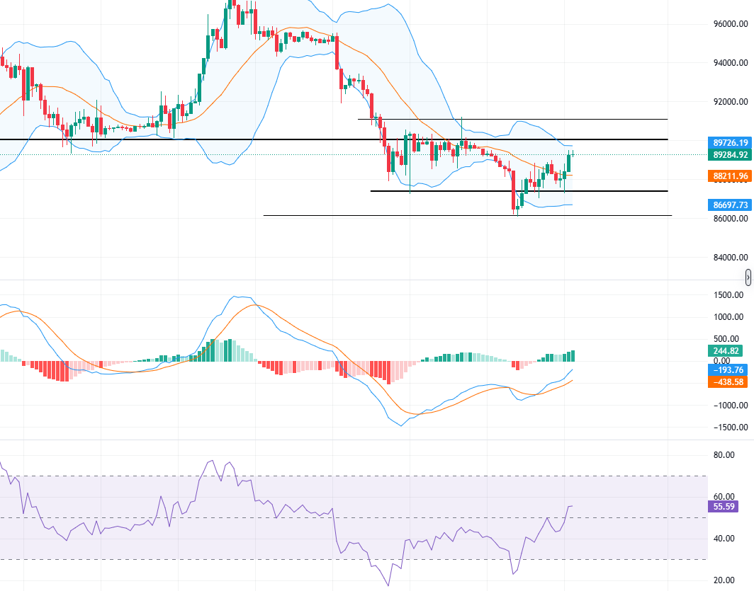 下方支撑位:短期支撑分别位于 88000 附近的四小时中轨和 87500 区域,这两个位置是价格回调后的关键防线,如果跌破会再次测试之前低点86000。