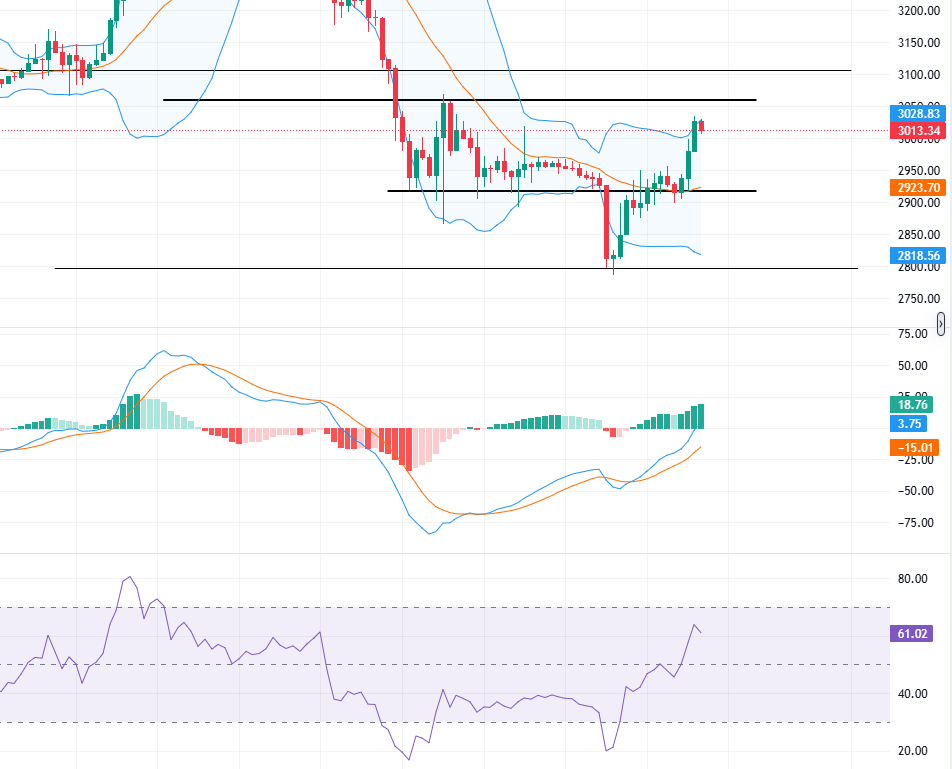 以太坊的技术面表现与比特币相似,目前的 短期阻力在 3050,3100 区域,而下方的支撑位则有所提升在 2900–2870 区域,这些区间将是市场接下来可能面临的价格波动范围。