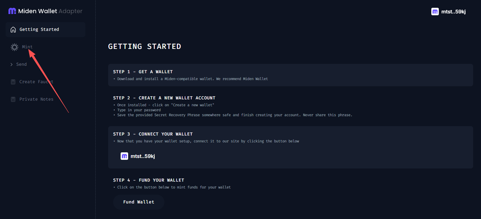 STEP 2. Go to the interaction website (link: https://miden.leo.app/), connect the newly registered address through the Miden Wallet extension, and click "Mint" in the left column to receive 100 test coins.