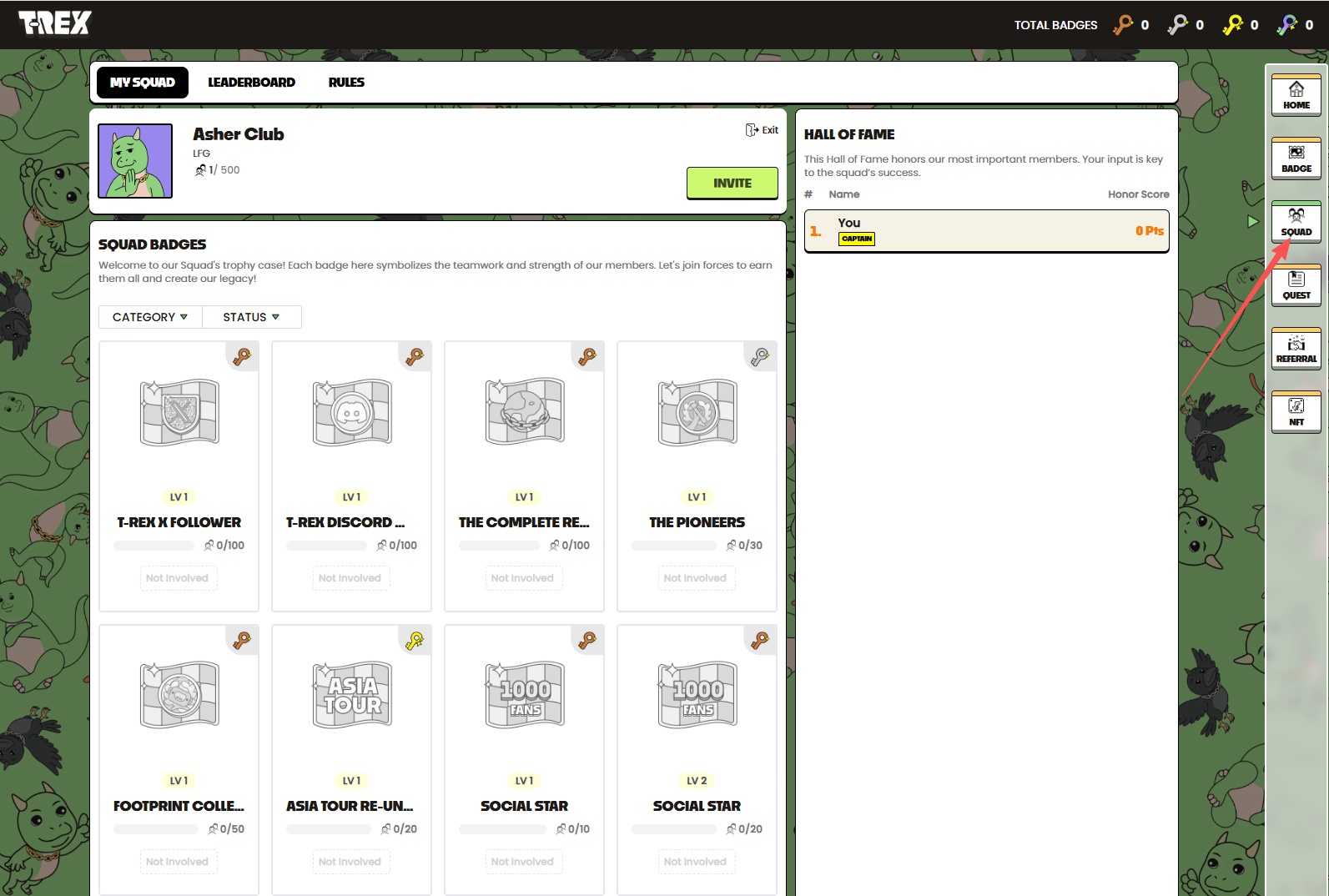 STEP 3. Click "SQUAD" on the right, choose a team to join, or join my team using the invitation link: s.trex.xyz/ll1g9K.