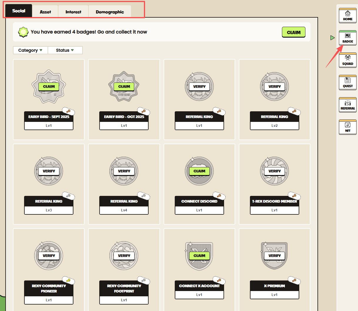 STEP 4. Click "BADGE" on the right, complete the corresponding tasks to unlock the corresponding badges.