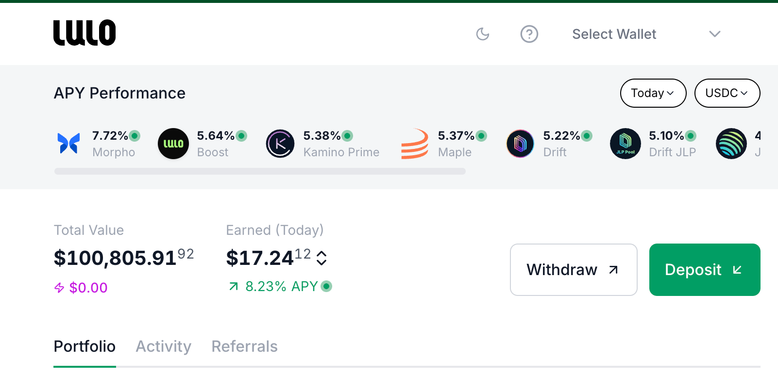 Lulo is a DeFi stablecoin yield platform based on the Solana ecosystem, focusing on providing users with "no trading, no noise" automated yield strategies.