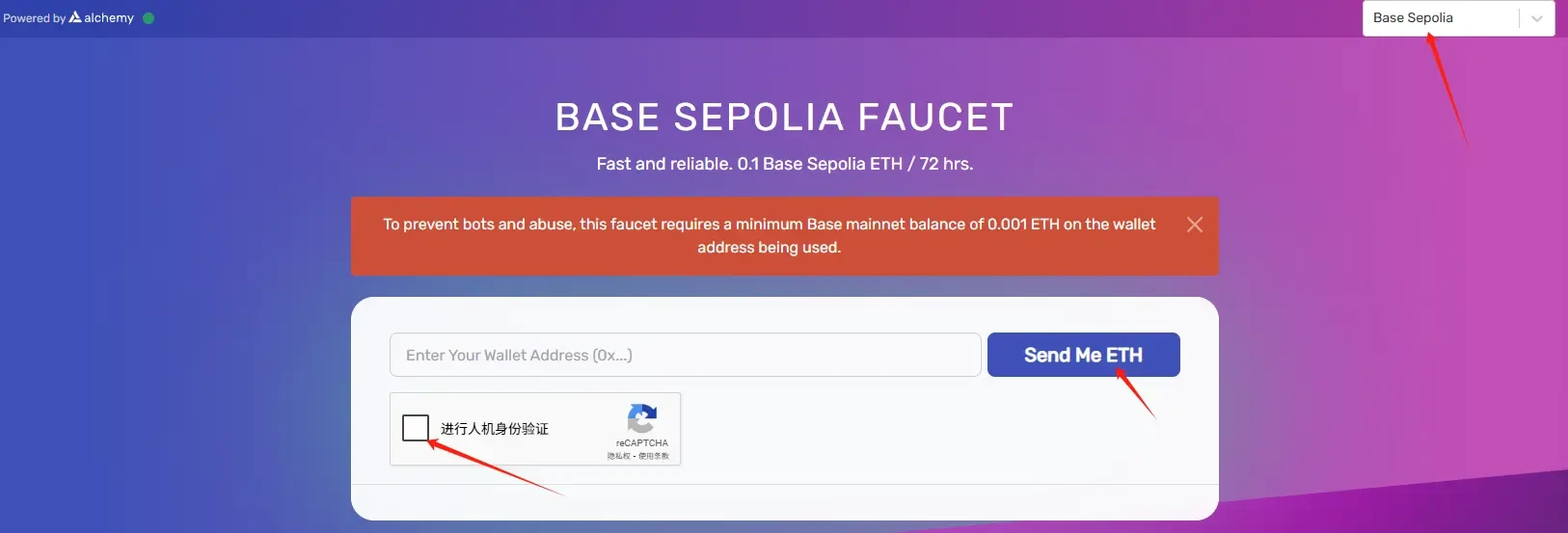 STEP 1. Go to the test coin distribution website (link: https://www.alchemy.com/faucets/base-sepolia), select the "Base Sepolia" test network, complete the human verification, and enter your address to receive test ETH (you need to have 0.001 ETH in your wallet on the Base mainnet to claim).