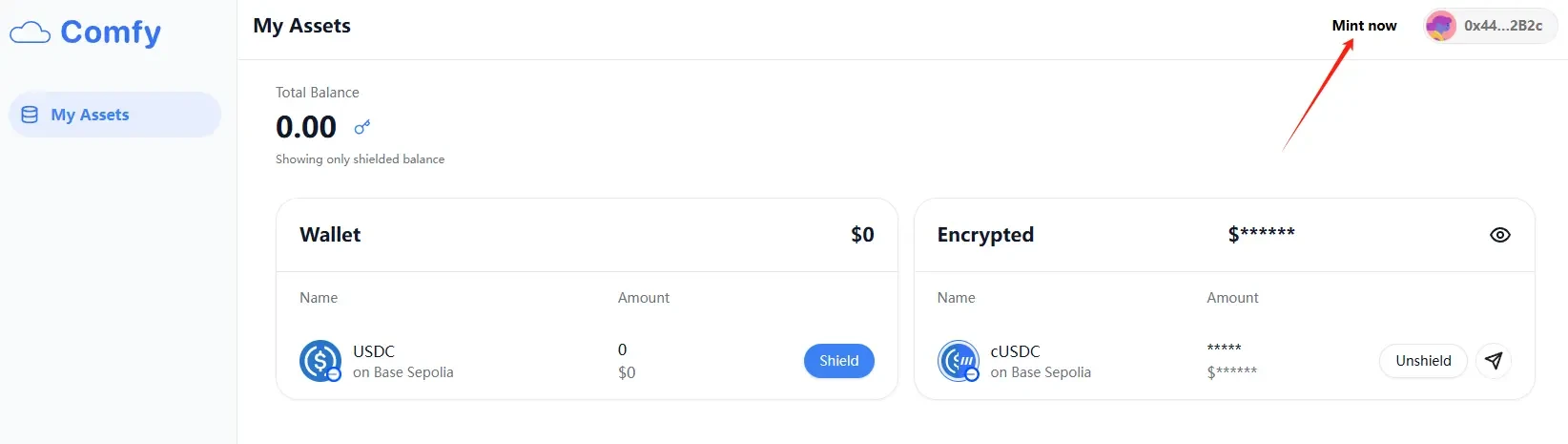 STEP 3. Go to the Comfy project interaction website (link: https://comfy.inco.org/), click "Connect Wallet" and then select "Mint now" to mint USDC.
