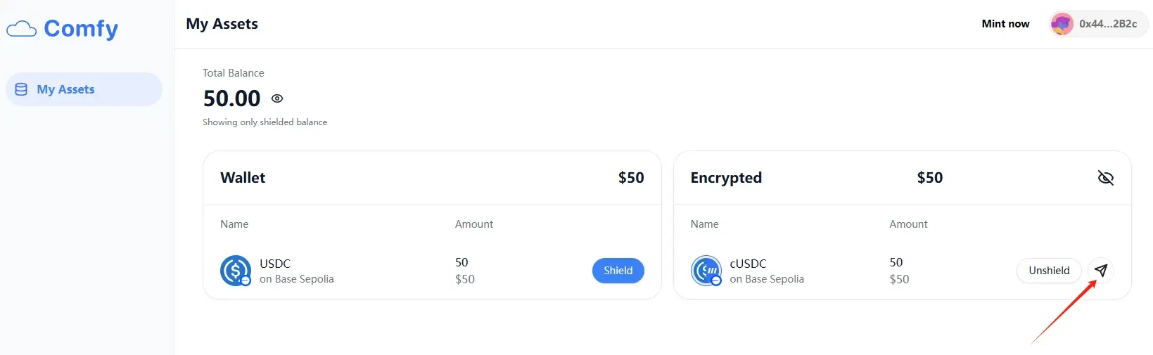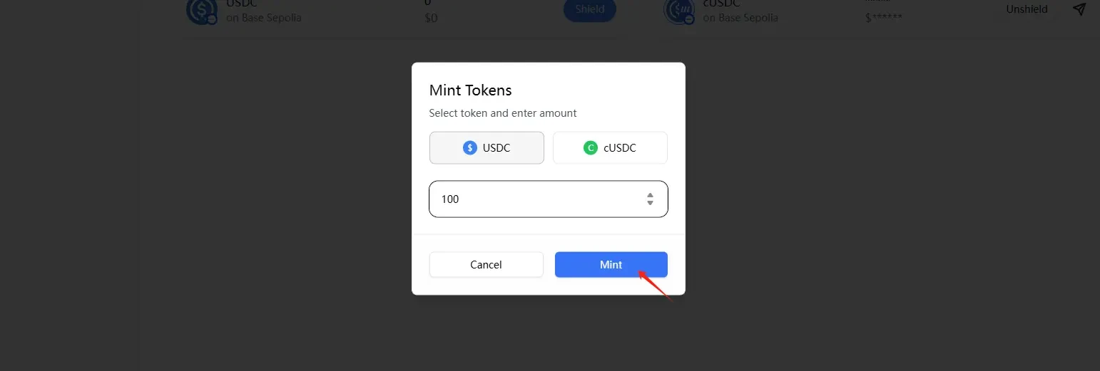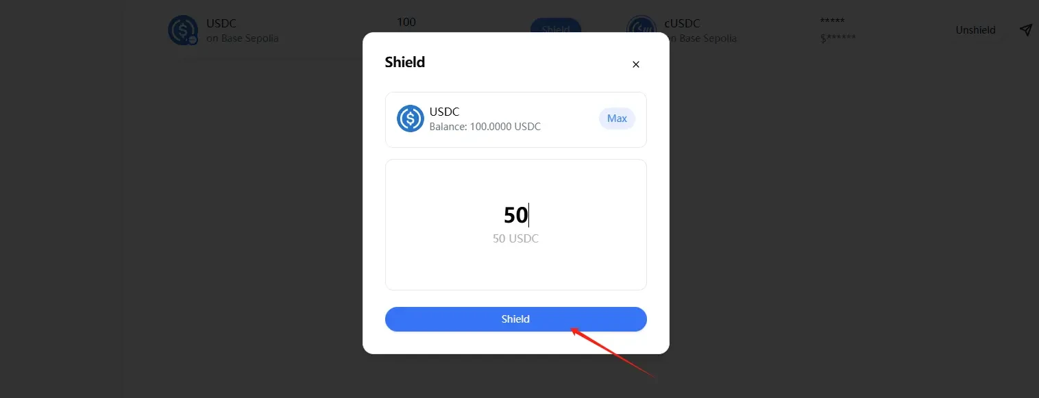 STEP 4. Select "Shield" to exchange some USDC for cUSDC, then click "Unshield" to exchange some cUSDC back to USDC.