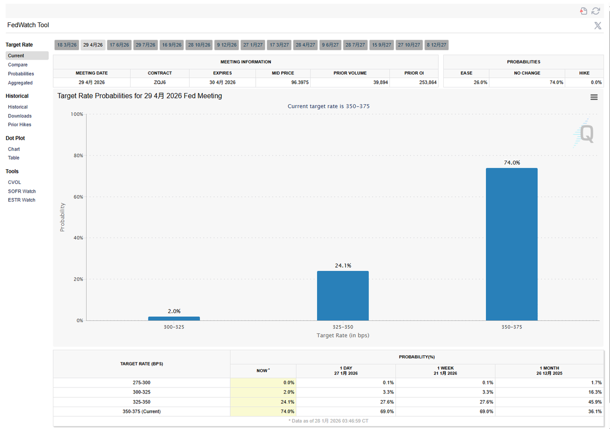 维持2%不动摇,看数据以及不预期,所以市场的关注重点还是在鲍威尔的接班人上,而且一月不降息已经有了足够的预期,甚至是三月的点阵图应该热度都不会很高。目前 CME 的预测数据来看,3月甚至4月的降息预期都很低,大概率就要等美联储主席更换以后了。