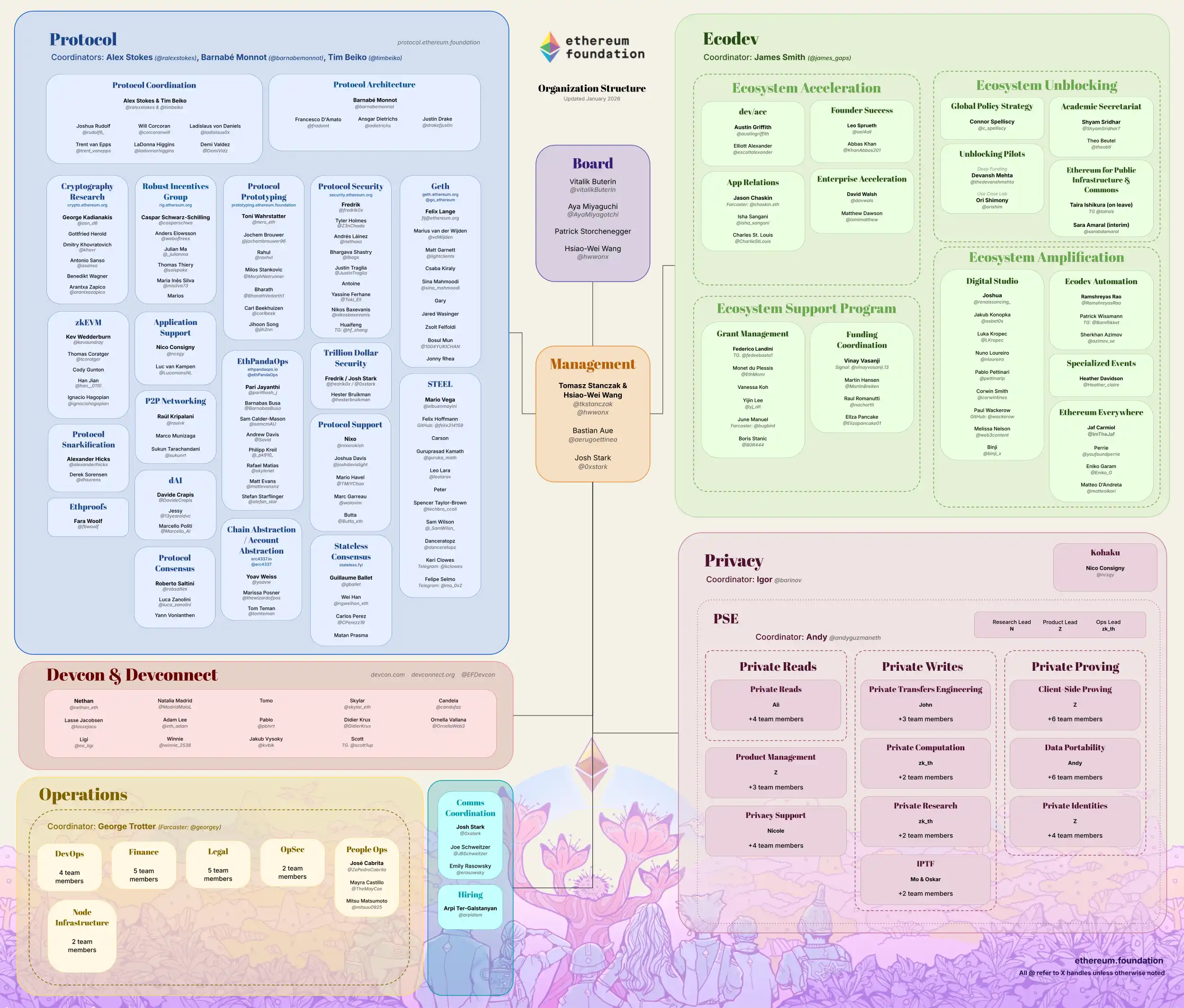 以太坊基金会完整的组织架构,dAI 团队与隐私、扩容团队并列为核心战略方向