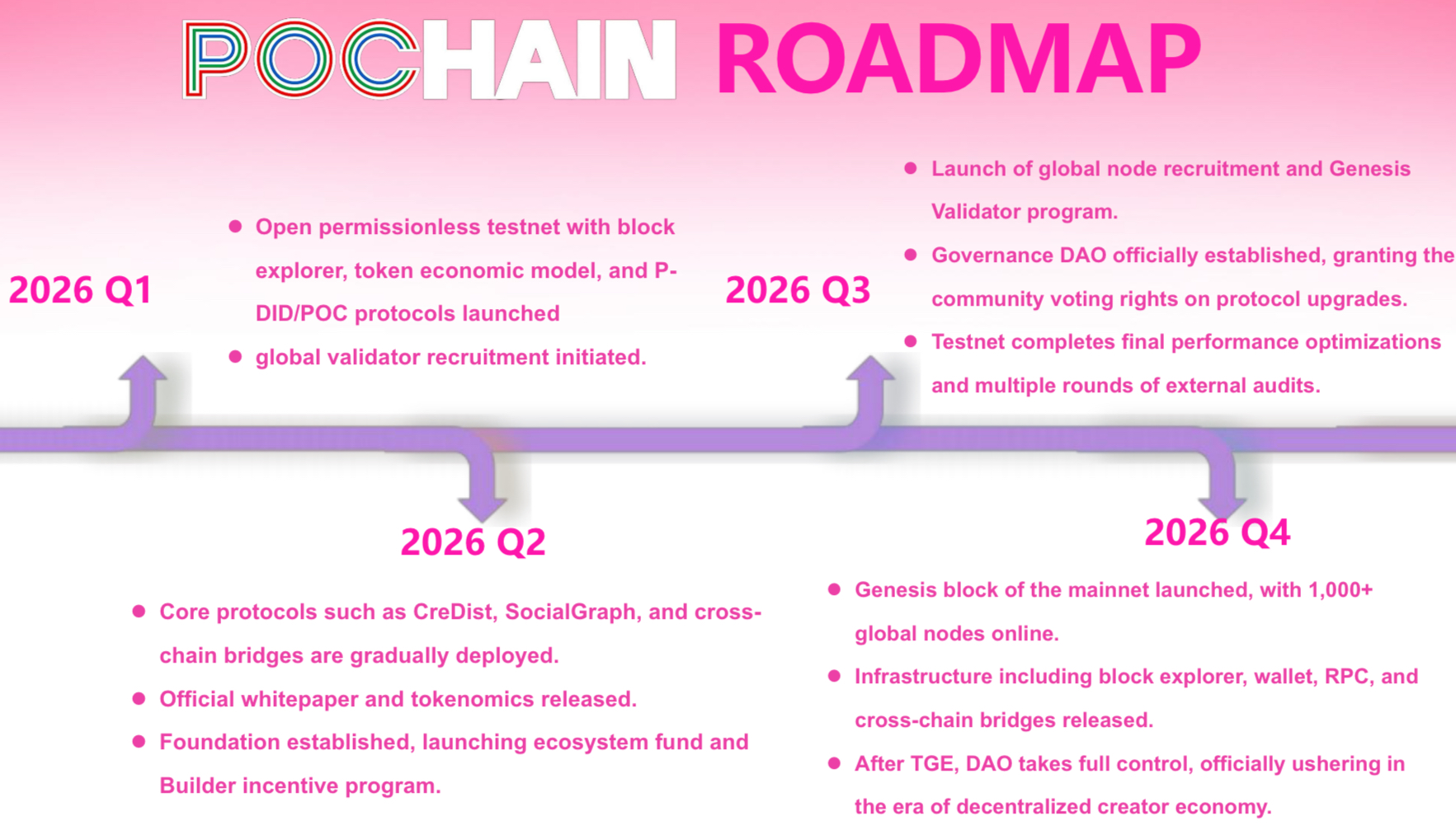 • POChain:专为 Web3 创作者与开发者量身打造的,一条独立运行、拥有完整主权的 AIGC 数字内容 L1 公链,在 EVM 层与 BNB Chain 完全兼容,致力于构建面向内容创作的新一代基础设施。由 MEETLabs 和 MEET Foundation 联合孵化,搭建 MEET48 官方代币 $IDOL 与公链原生代币 $POC 的置换池,用于承接早期 $IDOL 投资价值,按时间与生态里程碑,分阶段、有限度地向公链原生代币 $POC 转化。POChain 生态将在 2026 年根据 Roadmap 陆续发布上线以下产品: