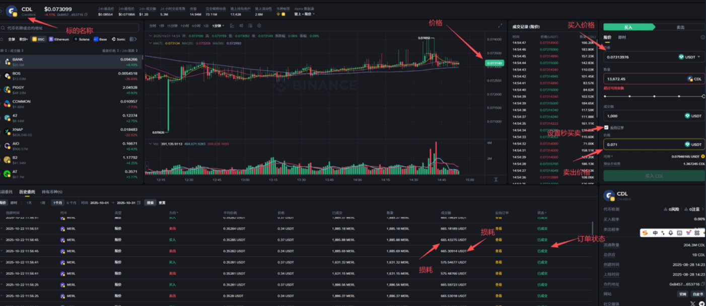 选标的可是刷分的关键,记住这几点:下跌趋势千万别碰!越刷越亏,纯纯送手续费,咱们又不是来当 “接盘侠” 的。最理想的是价格稳定的时候,10U 买、10U 卖,只亏点手续费就行 —— 很多朋友刷了一个月就停了,错过了好多值钱的空投,太可惜了!