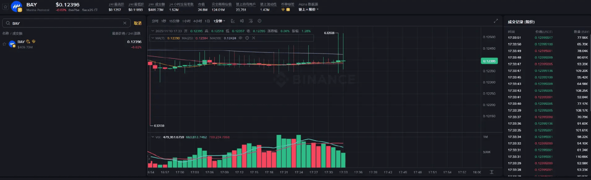 价差基点为 0 的时候最稳,再看看 1 分 K 线和成交记录,没波动就可以开刷。如果价格只有最后一两位波动,直接默认价格速刷,16 个来回 2 分钟就搞定,比用反向订单快多了