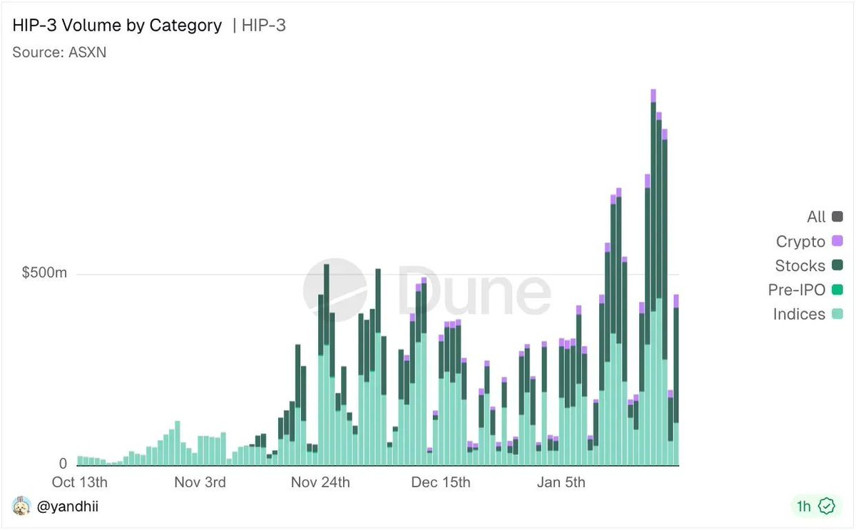 以 HIP-3 为例,它为专业交易者提供了一个可以系统性做 basis trading、捕捉跨市场错位、同时覆盖股票、加密资产和指数的交易界面。在潜在空投激励的叠加下,交易量不断刷新新高。