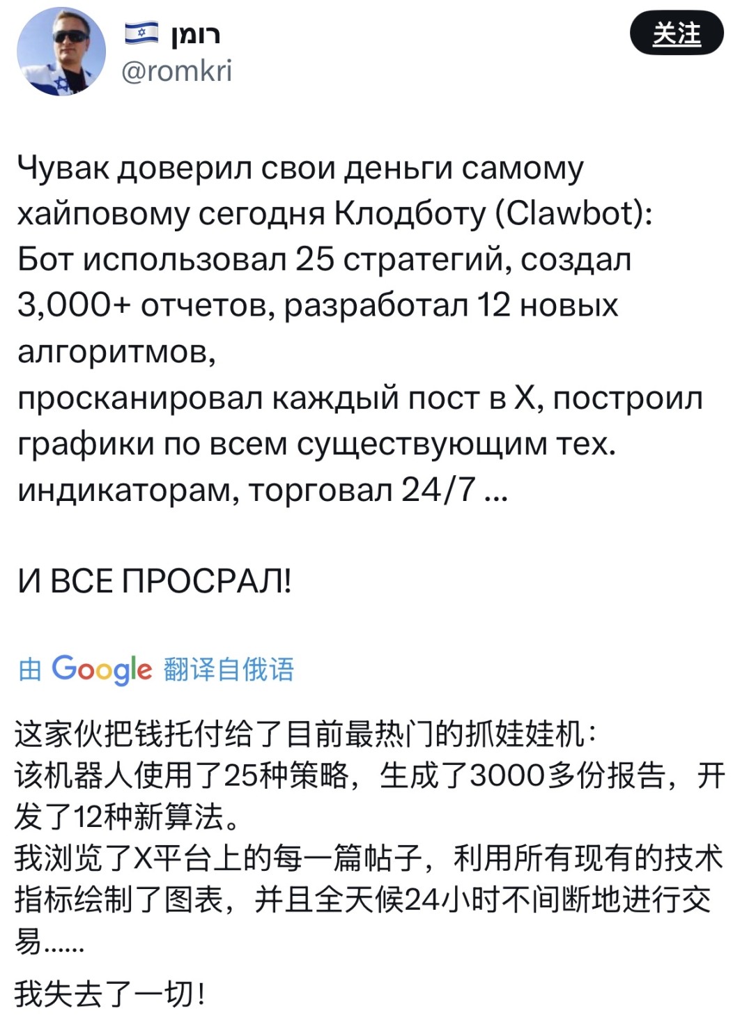 博主用 ClawdBot 全权交易,结果:「亏光了,但过程真美」