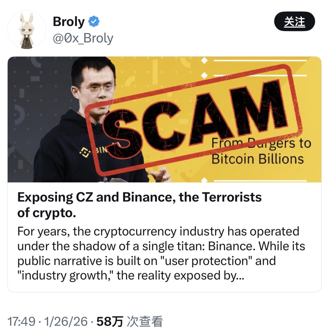 本周,币安创始人 CZ(赵长鹏)在海外舆论场遭遇了一波集中质疑。先是「木头姐」Cathie Wood 在采访中,将近期比特币的弱势部分归因于「币安在去年 10 月 11 日的软件故障,引发了约 280 亿美元的系统清算」。随后,一篇标题极具攻击性的短文《曝光 CZ 与币安:加密世界的恐怖分子》开始传播。
