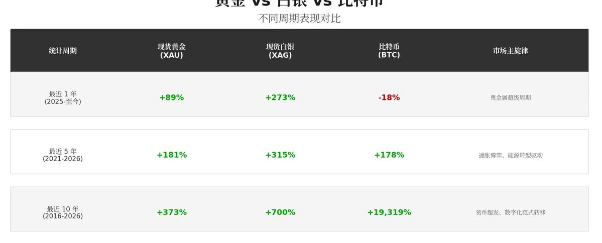 From a long-term perspective, Bitcoin remains one of the highest-returning assets. However, over the past year, Bitcoin's performance has clearly lagged behind that of gold and silver. The market trends from 2025 to early 2026 exhibit a stark binary divergence, with the precious metals market entering a phase referred to as a "super cycle," while Bitcoin appears somewhat sluggish. Below are comparison data from three key cycles: