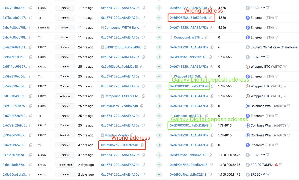 11 hours ago, the victim copied an address directly from transaction history to deposit into Galaxy Digital—but copied the poison address instead.