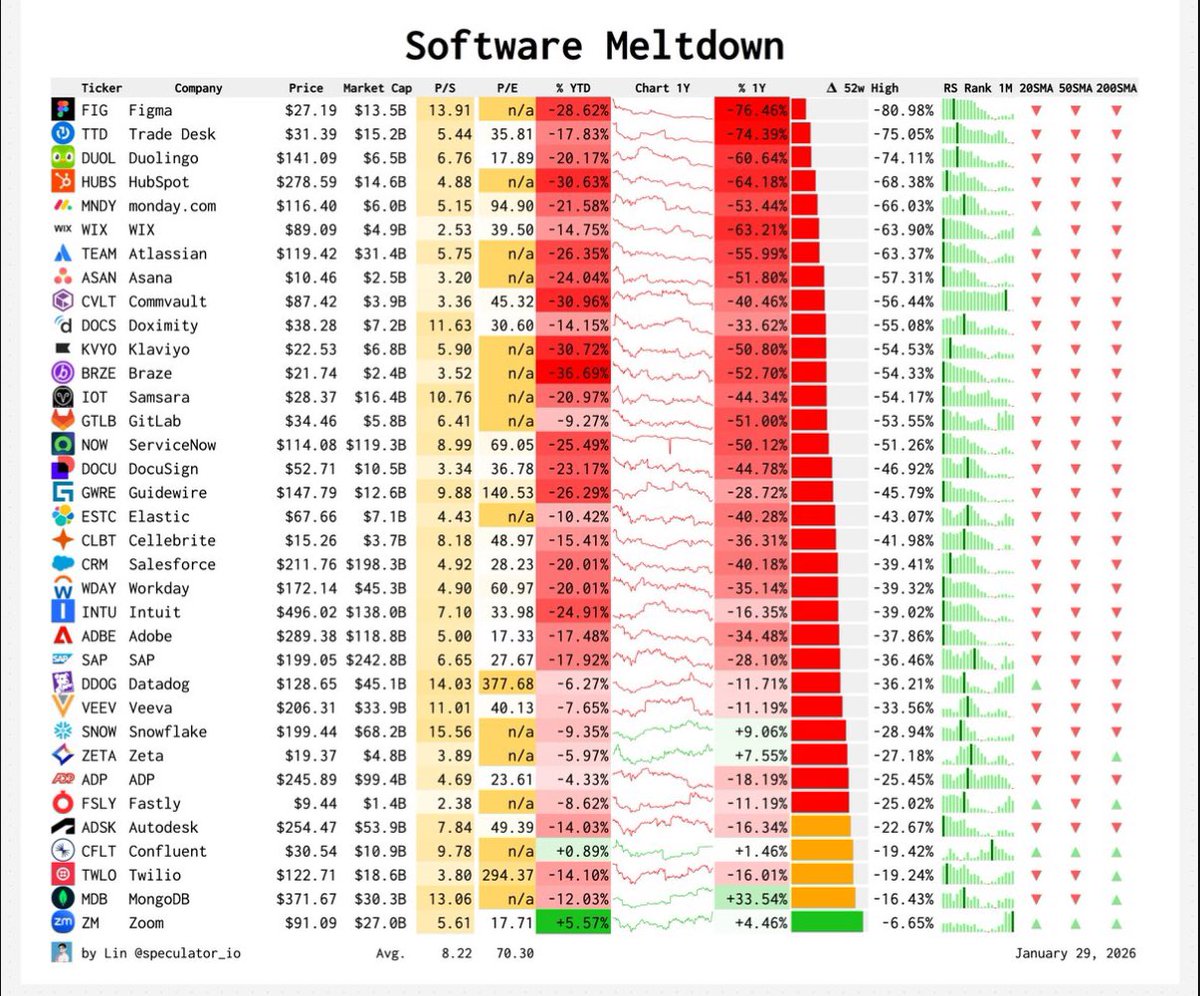 ⚠️ It's not just gold and silver; American software stocks have also crashed, facing the worst annual start in years!