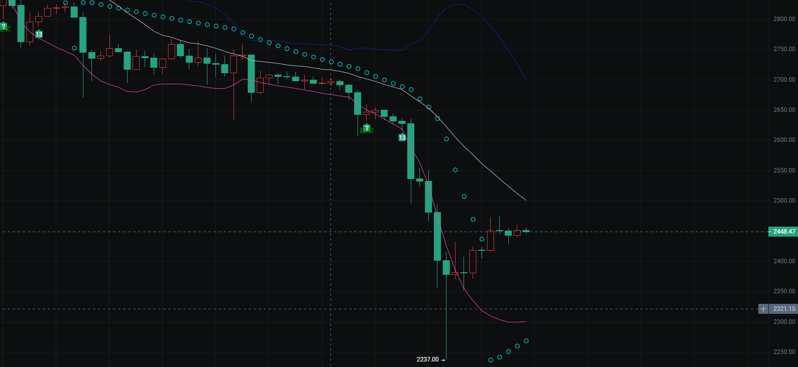 This is a stabilizing rebound trend after a one-sided sharp decline. The price has been declining from a high near 28500, reaching a low of 22370, followed by a series of small bullish candles, currently oscillating around 24450.