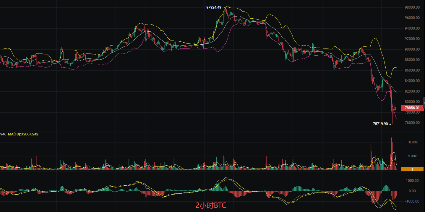 The current price of Bitcoin is 78,800. Li Ying has reminded everyone that the market is currently dominated by short-term trends, and it is advisable to follow the trend. The current market situation has been validated, with a significant drop in the daily line indicating strong selling pressure. The 2-hour K-line shows a fluctuating rebound trend, but overall it is still in the recovery phase after the previous sharp decline. The MACD shows weakening momentum, indicating a short-term need for a rebound. The overall trend of the EMA remains bearish, and there is a high probability that the main force will attempt to break the 80,000 mark in the short term. Short-term traders can pay attention to the 80,000 level; if the situation is unfavorable, they should take profits and reverse their positions.