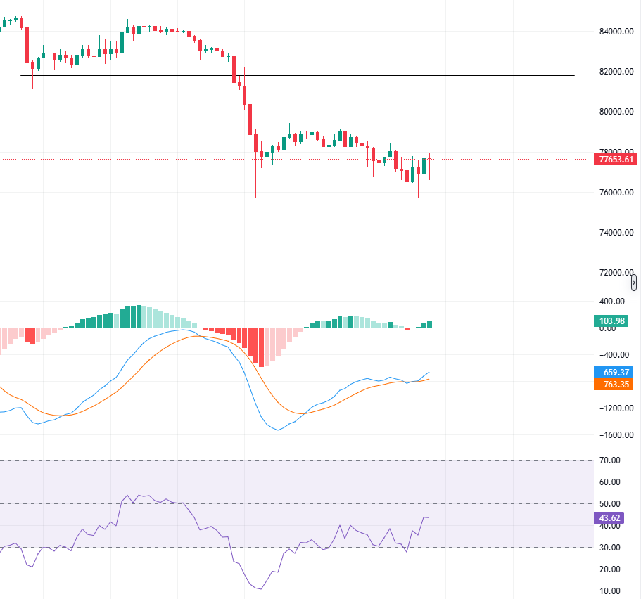 支撑位:短期内,比特币的支撑位集中在 76000 区域。如果价格跌破这一支撑,可能会加剧下行压力,测试 74000 甚至 72000 区域。