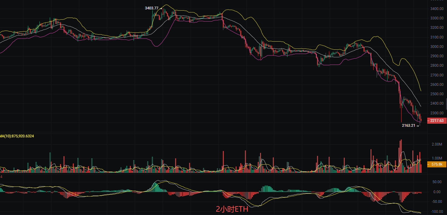 Before publication, the current price of Ethereum is 2,225, and the downward trend continues. Liying advises not to chase the market and suggests waiting for stability before entering. The daily chart shows consecutive large bearish candles dropping from a high of over 3,000 to around 2,200, indicating a clear bearish trend. The 2-hour K-line shows heavy selling pressure above, while the lows are gradually declining. The MACD on both the daily and 2-hour charts is dominated by bearish momentum. The EMA short-term, medium-term, and long-term moving averages are all in a bearish arrangement, with a large amount of main capital withdrawing and no signs of entering the market in the short term. At this point, a market crash has become a foregone conclusion. It is essential to manage stop-loss and take-profit levels and ensure risk control before re-entering the market.